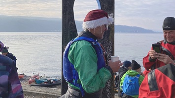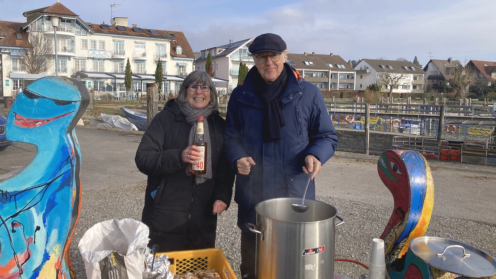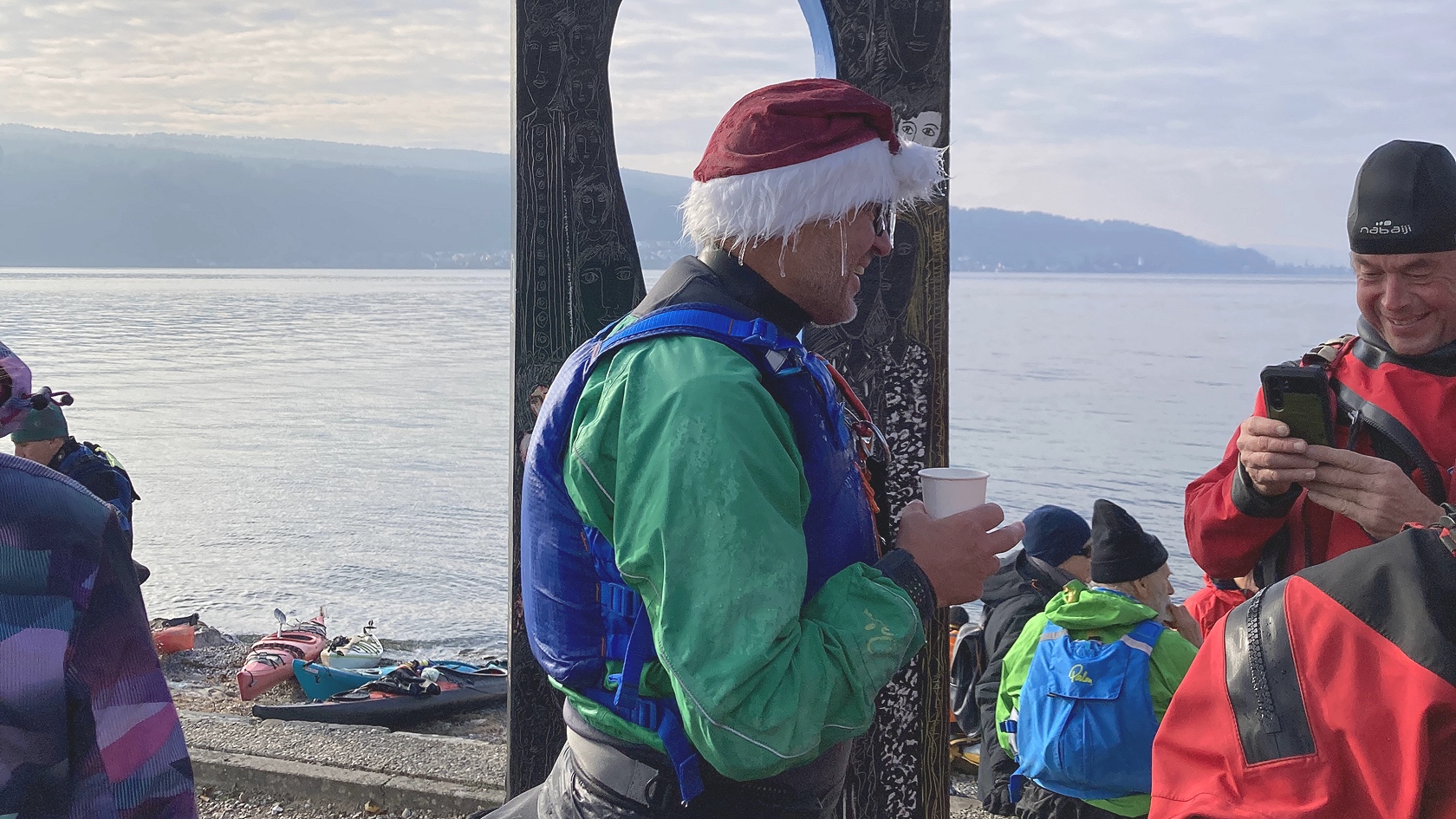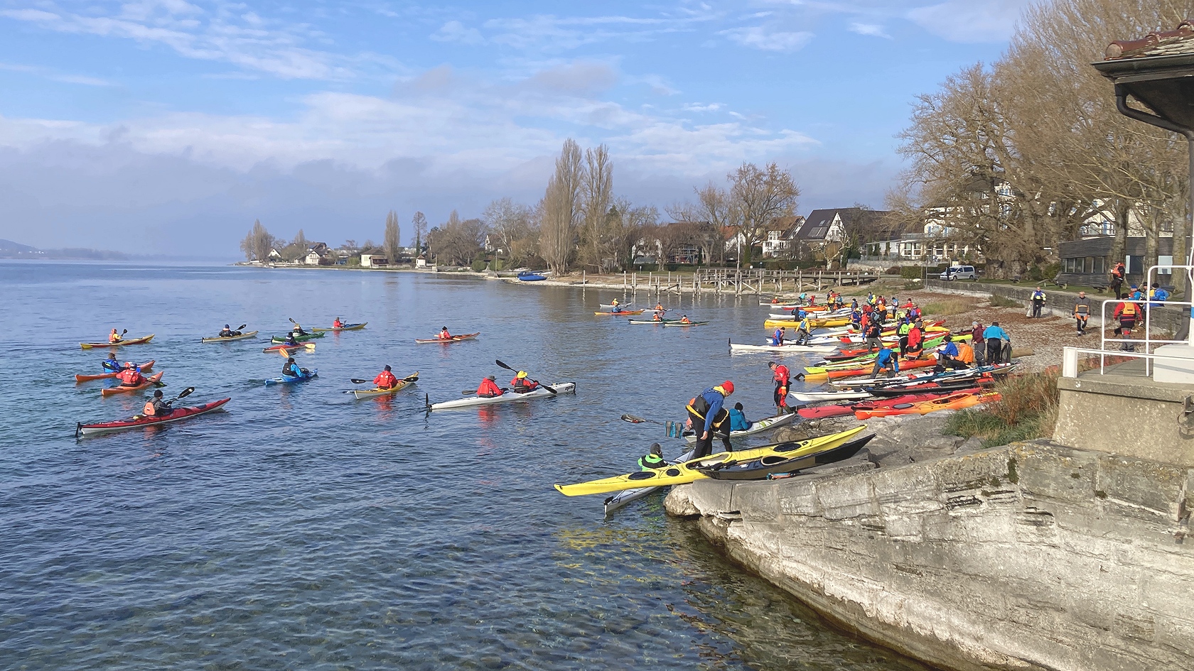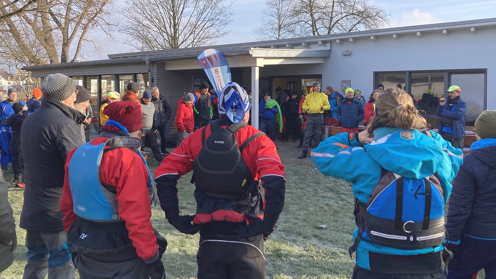 In Konstanz angekommen, wärmten wir uns erst einmal mit heissem Kaffee und einer kräftigen Gerstensuppe auf. Danach gab es eine herzliche Begrüssung durch den organisierenden Bodensee-Kanu-Ring. Der Tenor: "Gemeinschaftlich und gemütlich soll es sein!". Die Route wurde besprochen, und wir staunten nicht schlecht: Über 140 Paddler*innen aus verschiedenen Vereinen waren dabei. Die Prognosen versprachen weiterhin frostige Temperaturen – eine Eisfahrt im wahrsten Sinne des Wortes!